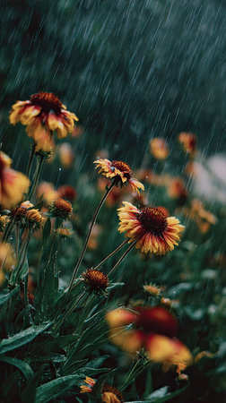 Blanket flower in a storm, heavy rain pouring down, strong winds twisting their leaves, natural.
