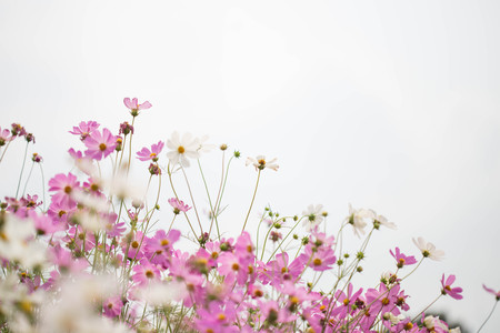 Colorful cosmos flowers on blue sky background, vintage color tone.
