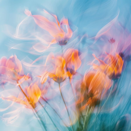 Delicate flowers of various colors drift in soft light, creating gentle atmosphere.
