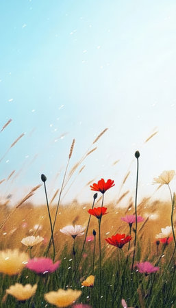 A beautiful meadow filled with colorful wildflowers sways gently in the breeze. The soft morning light casts a warm glow, creating a serene atmosphere filled with joy and beauty.