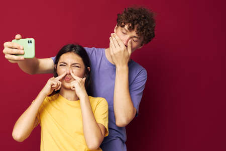 Woman man cheerful couple with phones in hand social networking and communication crooked smile fun and fight, in yellow background. The concept of real family relationships, freelancers, work online.