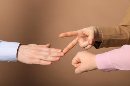 Fingers art of family during quarrel. Concept of man and woman can not divide property after divorce.