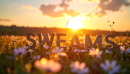 Word SWEANS made of wooden letters on green grass with flowers at sunset