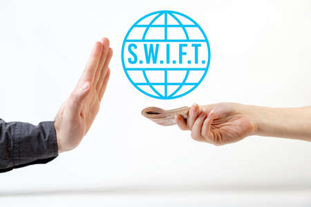 A woman's hand holds out a cash to a man's hand, which refuses. White background with SWIFT icon. The concept of disconnecting from SWIFT.