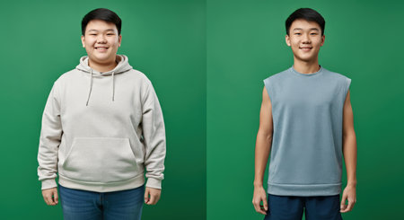 Transformation journey of asian male teen from casual to athletic wear on green background