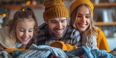 Family Sorting Clothes for Donation in a cozy way. Concept Family Activities, Organizing, Clothes Donation, Cozy Setting