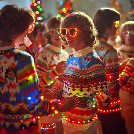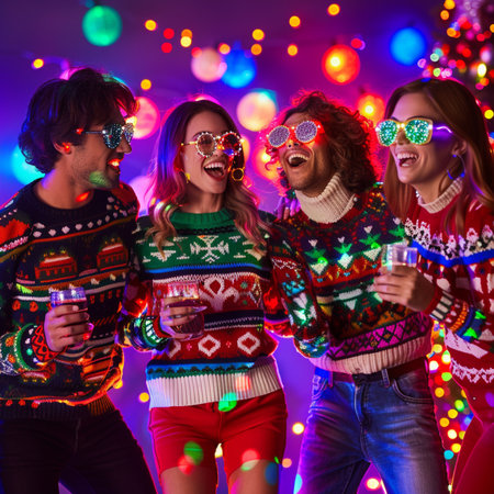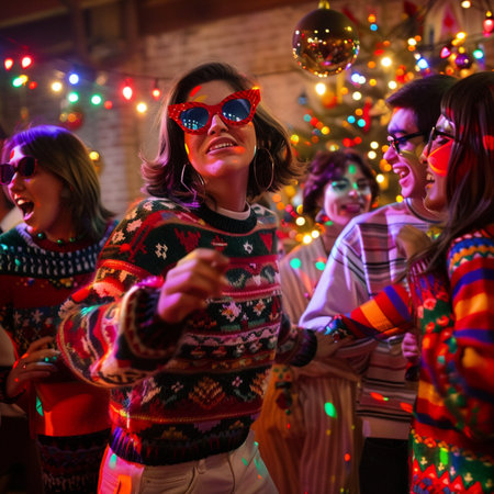 Friends wearing ugly Christmas sweaters share laughter and joy as they dance around a Christmas tree adorned with colorful decorations and lights