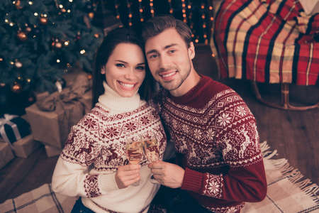 Adorable dreamy sweet cute friends with stemware of martini bonding, in knitted cute traditional x mas costumes with ornament, enjoy, december time, firtree, garland, night, toothy grins