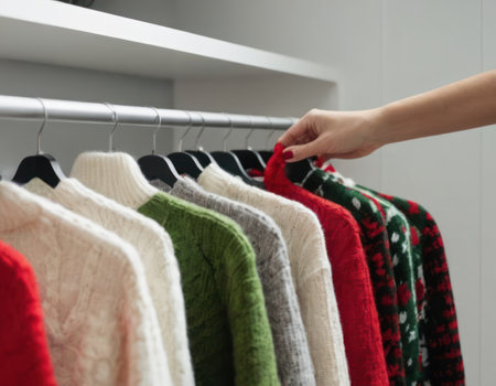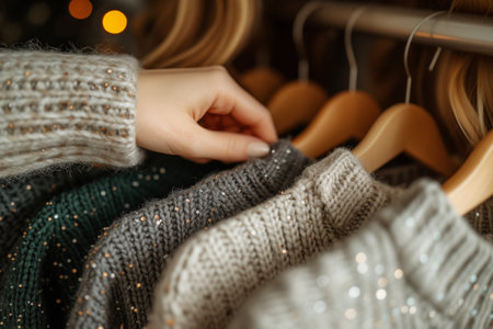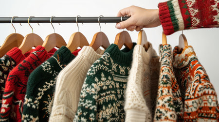 A womans hand reaching out to browse a rack of fashionable Christmas sweaters in a store.
