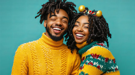 A joyful couple celebrates New Year's Eve with vibrant outfits, capturing a moment of laughter and warmth together, exuding happiness and festive spirit.