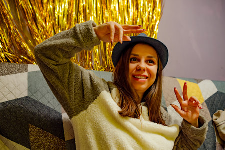 A woman wearing a blue hat is sitting on a couch, enjoying herself and dancing during a lively party. The background is decorated with golden streamers, adding to the festive atmosphere