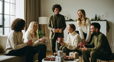 A group of six friends celebrating together in a cozy living room, exchanging gifts during a festive occasion, with a warm and joyful atmosphere