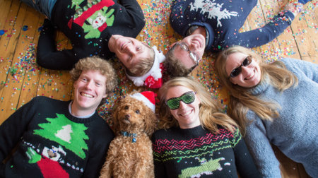 A diverse group of friends and a dog are lying on a wooden floor covered in confetti, all wearing festive ugly Christmas sweaters and smiling at the camera.