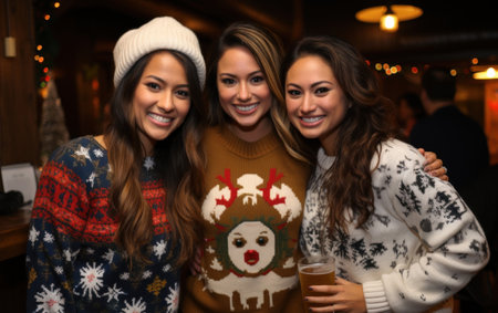 AI Generative Group of friends in ugly Christmas sweaters jumpers, men and women having fun at party