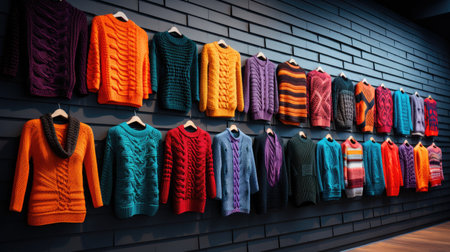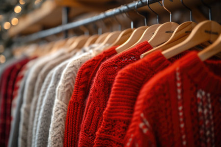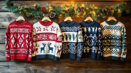Festive knitted sweaters with holiday patterns hang on wooden wall, adorned with pine garlands and warm lights, creating cozy and cheerful atmosphere.
