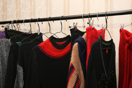 Colorful sweaters hanging on a clothes hanger in a wardrobe