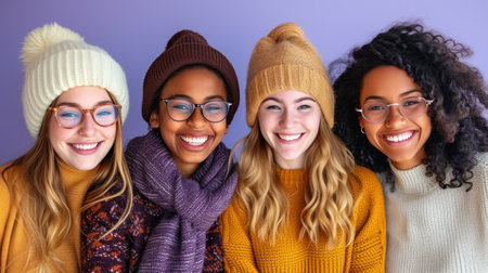four smiling young girls of different nationalities in sweater and hat against purple background, portrait