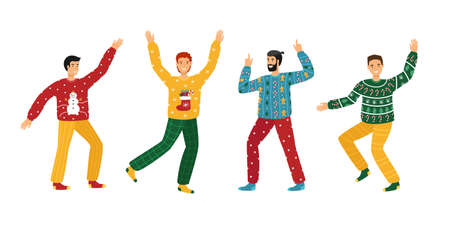 Ugly Christmas Sweater Party. Young men in Christmas sweaters are dance. Vector illustration