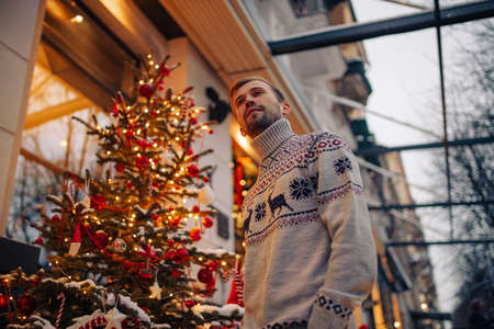Portrait of young thoughtful man in street decorated for Christmas against background of glowing garlands.
