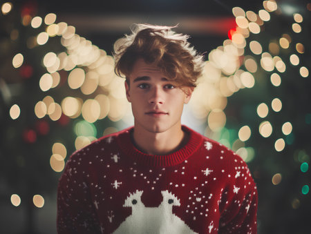 Portrait of a handsome young man in a red sweater on a background of Christmas lights