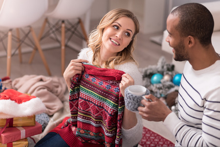 Great present. Nice cute happy woman holding a pullover and looking at her husband while being in a great mood