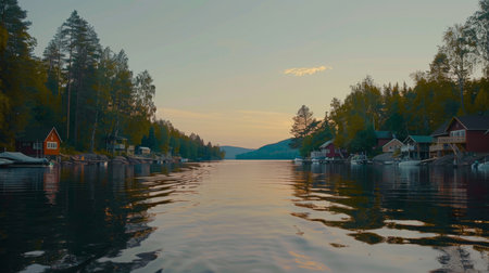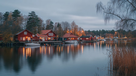 Colorful red houses reflect on calm water while boats rest peacefully by the Scandinavian village at dusk with soft glowing lights.