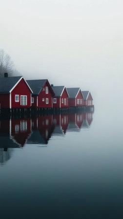 Red wooden cabins line a calm waterway, their reflections shimmering in the misty atmosphere. Fog envelops the area, creating a serene, tranquil environment.