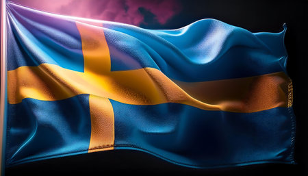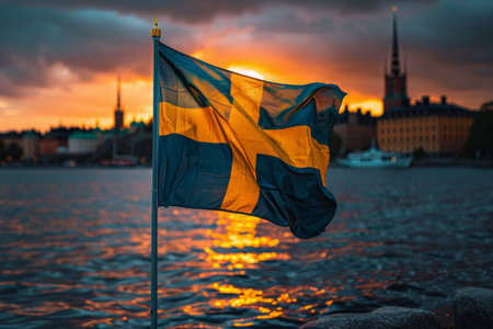 Swedish flag billows gracefully in the breeze as the sun sets over the water, casting a warm golden glow over the scene.