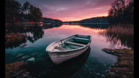 Tranquil scene of a still lake at sunset. A weathered rowboat sits gently on the water's edge. The image captures the peaceful ambiance of the natural surroundings. The colors of the sky are vibrant and the reflections on the water are serene.