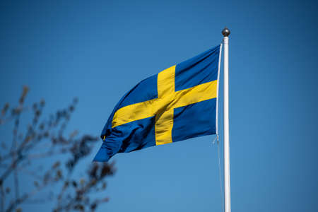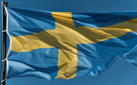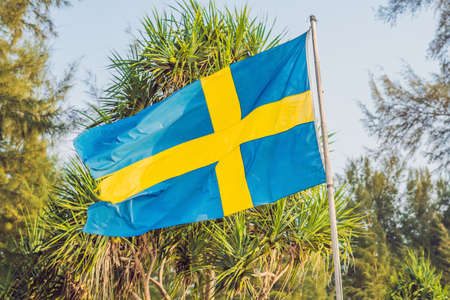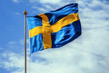 Blue flag of Sweden with a yellow cross fluttering in the wind. The concept of national symbols, international relations