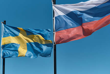 Flags of Sweden and the Russian Federation flutter in the wind against the blue sky. The concept of national symbols, international relations, and sports games. Close up shot