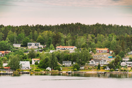 Charming Swedish houses along Stockholm fjord coast. Idyllic Nordic summer travel destination, perfect for vacation, relaxation, and exploring Scandinavian lifestyle