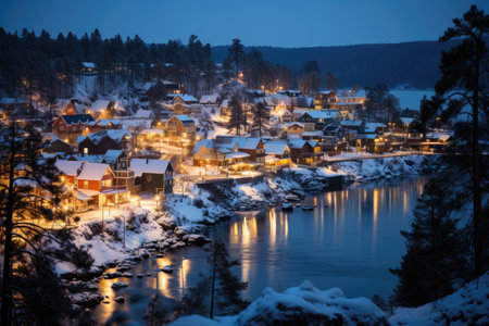 Fisherman village in Sweden at winter after sunset - winter seasonal scandinavian background