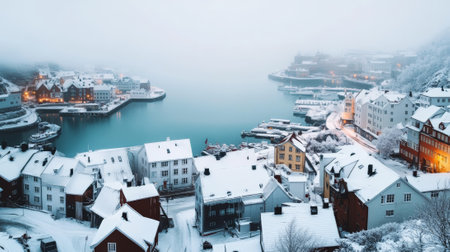 Snow covered houses and buildings create a serene winter scene in a coastal town, with calm waters reflecting soft morning light and gentle mist enhancing the tranquil atmosphere