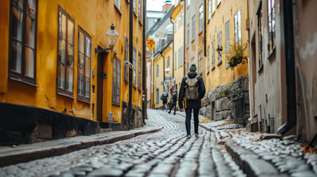 tourist walking on a cobblestone street with historic buildings on both sides generative ai