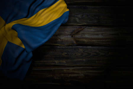 cute any feast flag 3d illustration - dark illustration of Sweden flag with big folds on old wood with free place for your content
