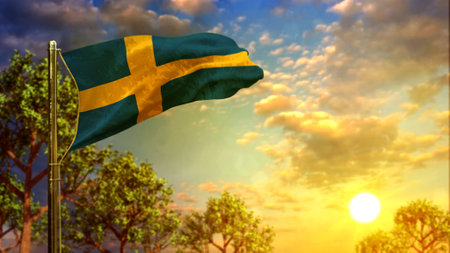 3D illustration of the national flag of Sweden on a metal flagpole fluttering against the blue sky.Country symbol.
