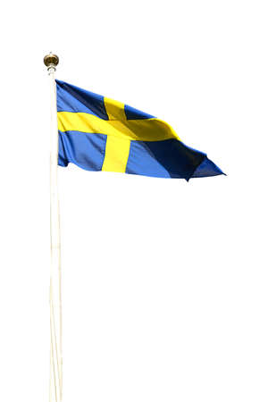 Swedish flag flying in blue with yellow cross isolated on white.