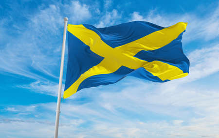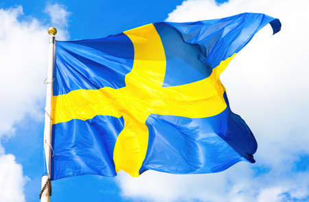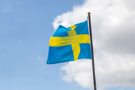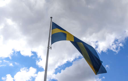 Swedish flag blue with yellow cross waving in the wind against a blue sky with clouds