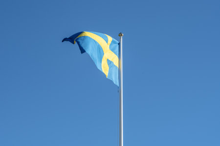 Detail of the national flag of Sweden waving in the wind on a clear day. Democracy and politics. North European country. Selective focus.