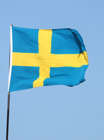 Swedish flag as proudly fluttering in the wind against a blue sky.