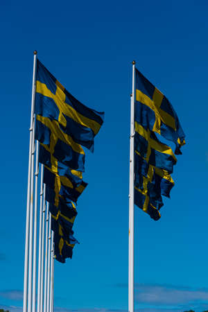 Swedish flag waving in the wind in Stockholm on the national day against a blue sky