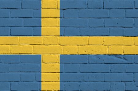 Sweden flag depicted in paint colors on old brick wall close up. Textured banner on big brick wall masonry background