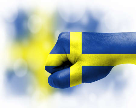 Flag of Sweden painted on male fist, strength, power, concept of conflict. On a blurred background.
