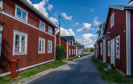 Picturesque summer houses painted in traditional falun red on dwellings island of the Stockholm archipelago in the Baltic Sea in the early morning.