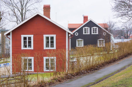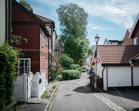 Traditional swedish houses colored with falu red dye. Tiled roofs. Empty street. Strängnäs, Mälaren lake, Sweden. Travel destinations, landmarks, sightseeing, vacations, recreation, estate, home