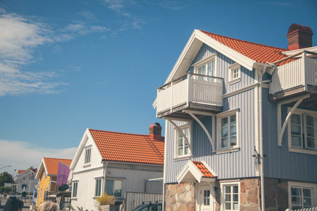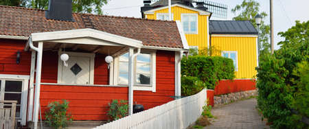 Charming Swedish houses along Stockholm fjord coast. Idyllic Nordic summer travel destination, perfect for vacation, relaxation, and exploring Scandinavian lifestyle