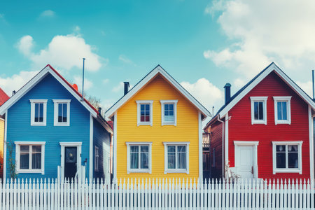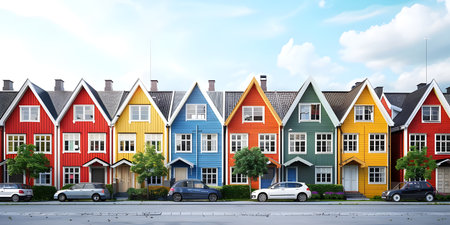 Row of colorful wooden houses. Illustration Generative AI