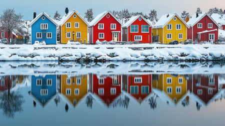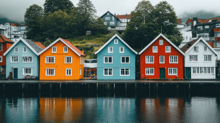Vibrant Scandinavian houses along Trondheim's waterfront, with colors mirrored in the sea, embodying the spirit of Norway's coastal architecture