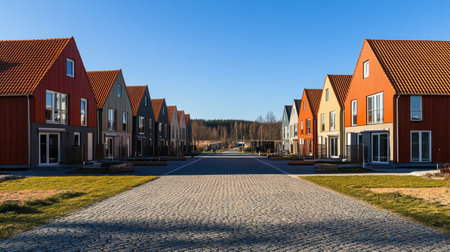 Bright and vibrant residential neighborhood showcasing colorful houses under a clear blue sky with a picturesque cobblestone pathway, perfect for urban living.